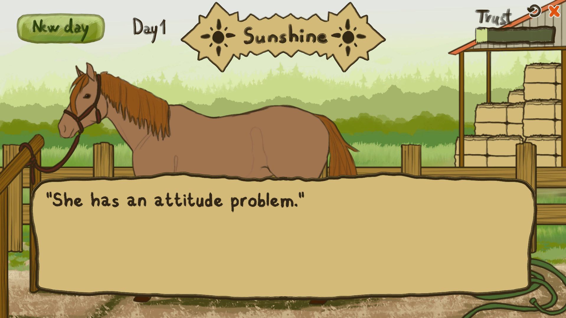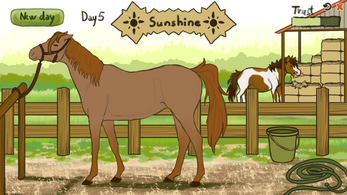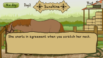 In Equine Stress, you become the owner of a red mare. You have to carefully examine her body language and guess at what is stressing her out - if she seems calm, pet her! Each correct action you take will increase trust, while guessing wrong will decrease it a bit.